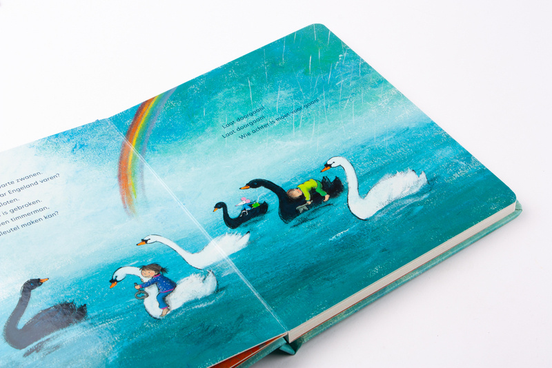 Ze ontmoet de zwarte en witte zwanen onderweg naar Engeland en gaat zwemmen met alle eendjes in het water. Ken je alle liedjes? Met onder andere 'Boer, wat zeg je van mijn kippen', 'Klap eens in je handjes', 'Slaap, kindje, slaap', 'Poesje mauw, kom eens gauw' en 'Hoedje van papier'. Het kleurrijke, stijlvolle boekje is van stevig gebonden karton.