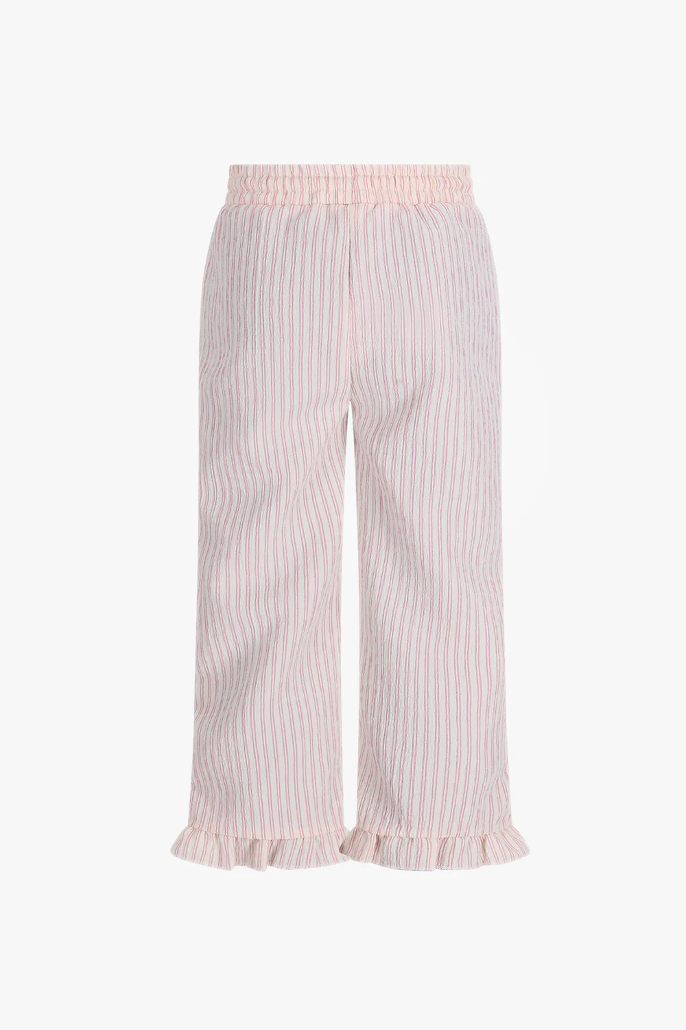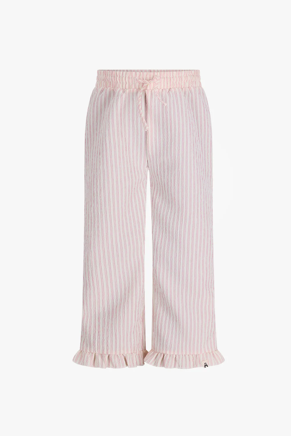 Broek Tate in wit met roze streepjes is een luchtige en comfortabele broek met een speelse uitstraling. De rechte pijpen en subtiele ruches aan de zoom geven de broek een zachte, girly touch, terwijl de elastische taille zorgt voor optimaal draagcomfort.